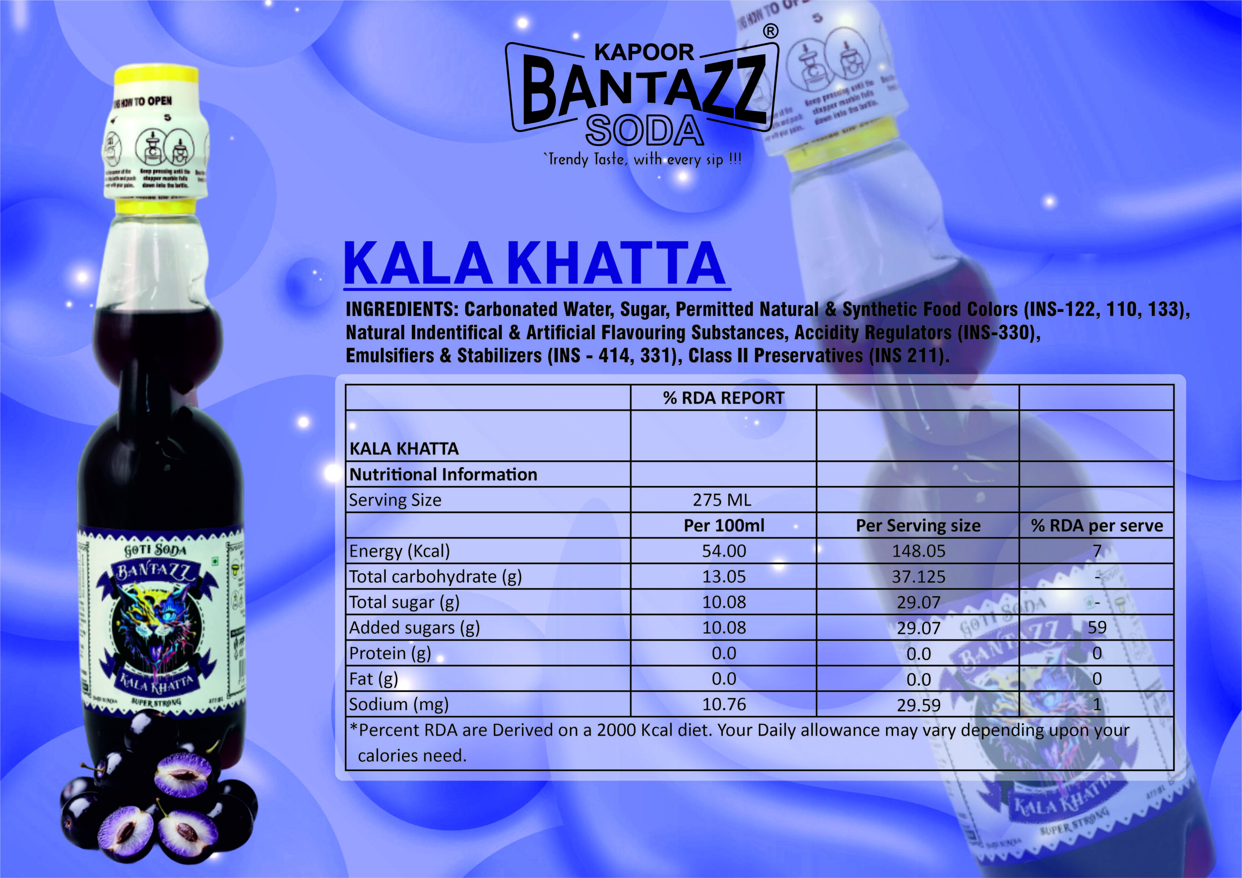 Kalakhatta Bantaz Goti Soda : A classic desi favourite with a bold sweet-and-tangy kalakhatta taste. Packed with nostalgic flavours and a strong fizzy punch that refreshes instantly.