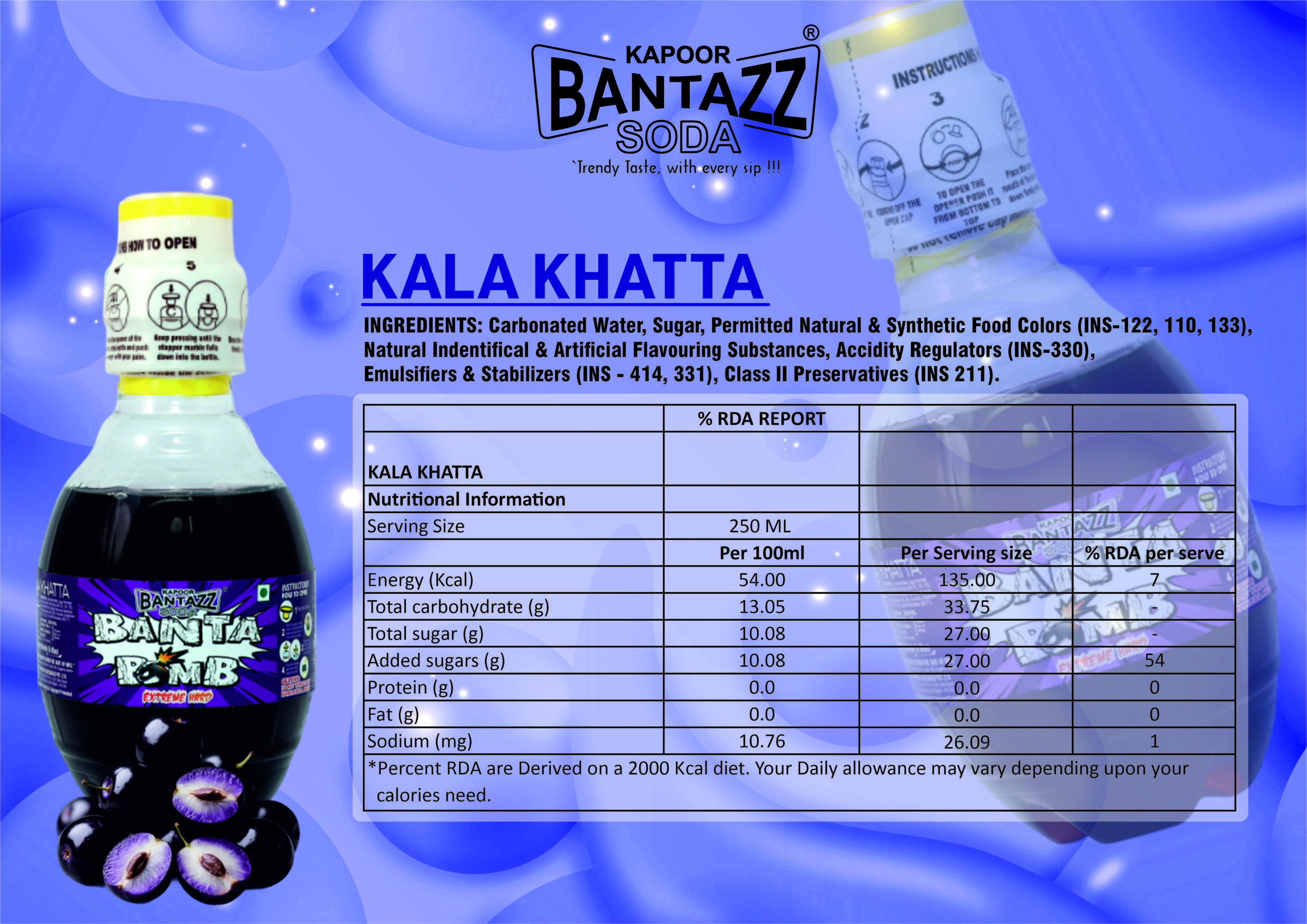 Kalakhatta Banta Bomb Goti Soda : The ultimate throwback with a modern fuse. Experience the deep, soul-satisfying tang of classic Kalakhatta, supercharged with a powerful fizz. It’s bold, it’s nostalgic, and it’s dripping with authentic desi attitude.