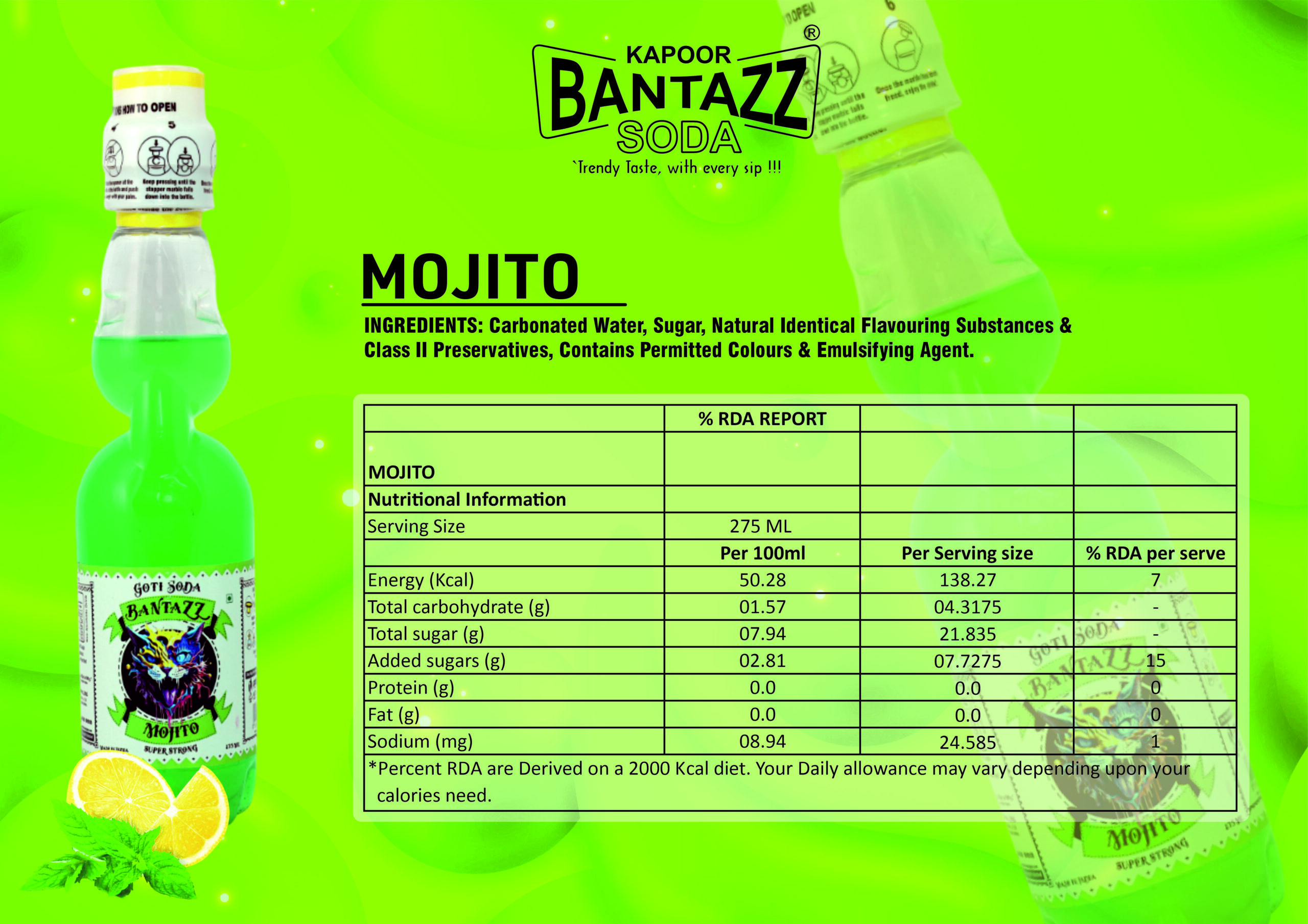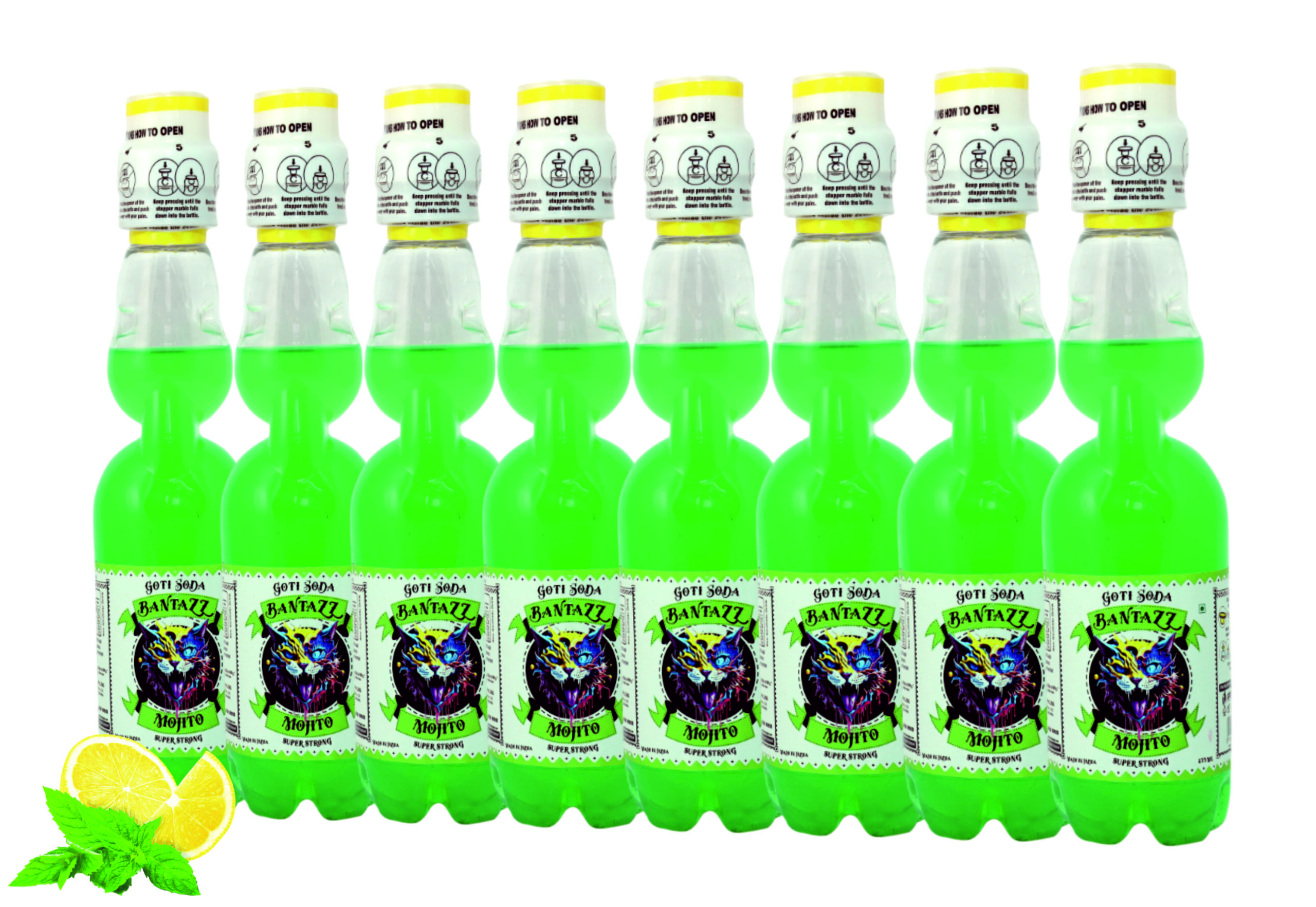 Mojito Bantaz Goti Soda: A refreshing fusion of mint and lime with a cool, smooth fizz. Lightly sweet, extra refreshing, and perfect for a modern, chilled soda experience.