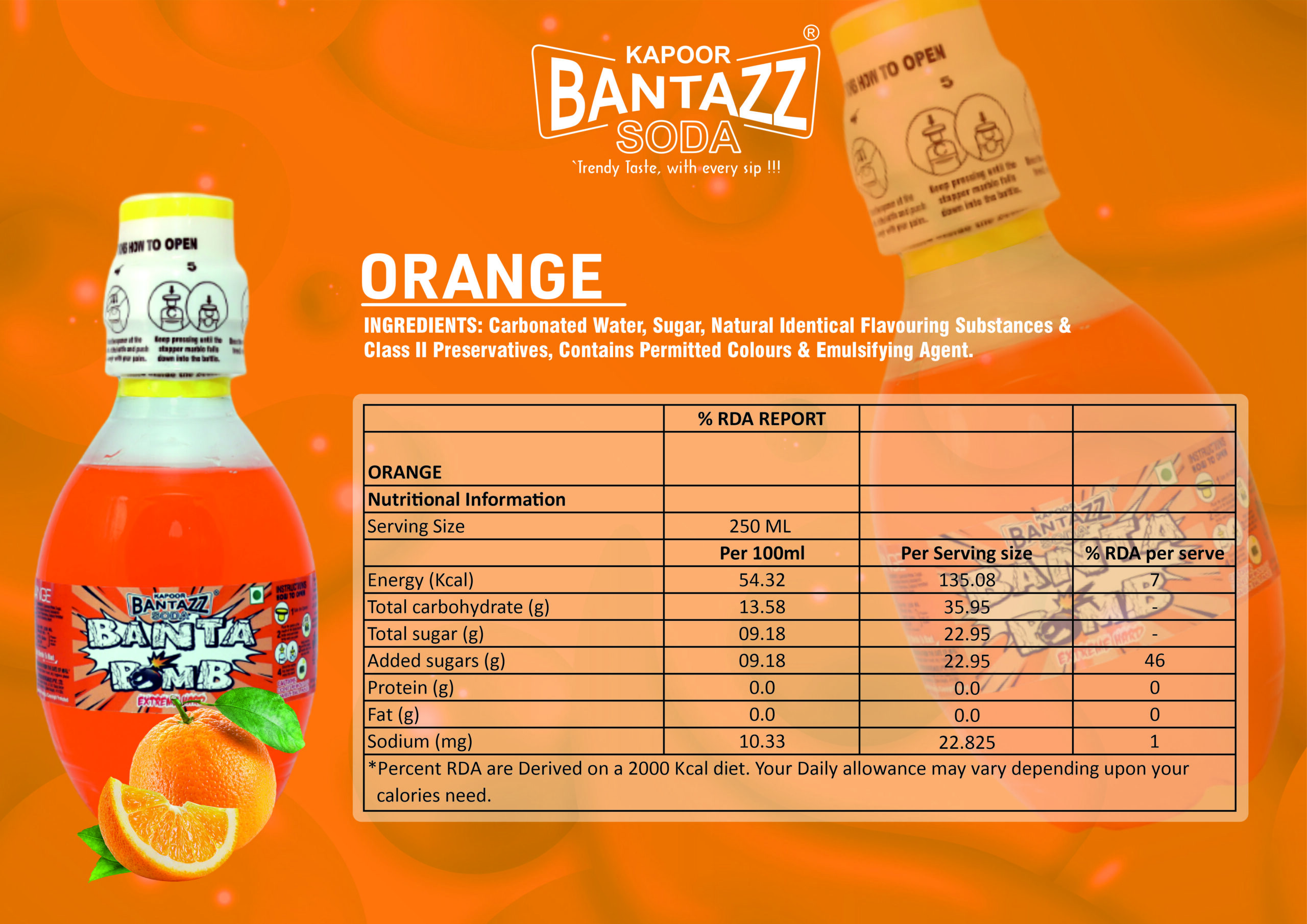 Orange Banta Bomb Goti Soda : Liquid sunshine with a heavy charge of carbonation. Every sip delivers a juicy, sun-ripened orange flavor that explodes into a sweet and tangy energy boost. Vibrant, bold, and unapologetically fruity.