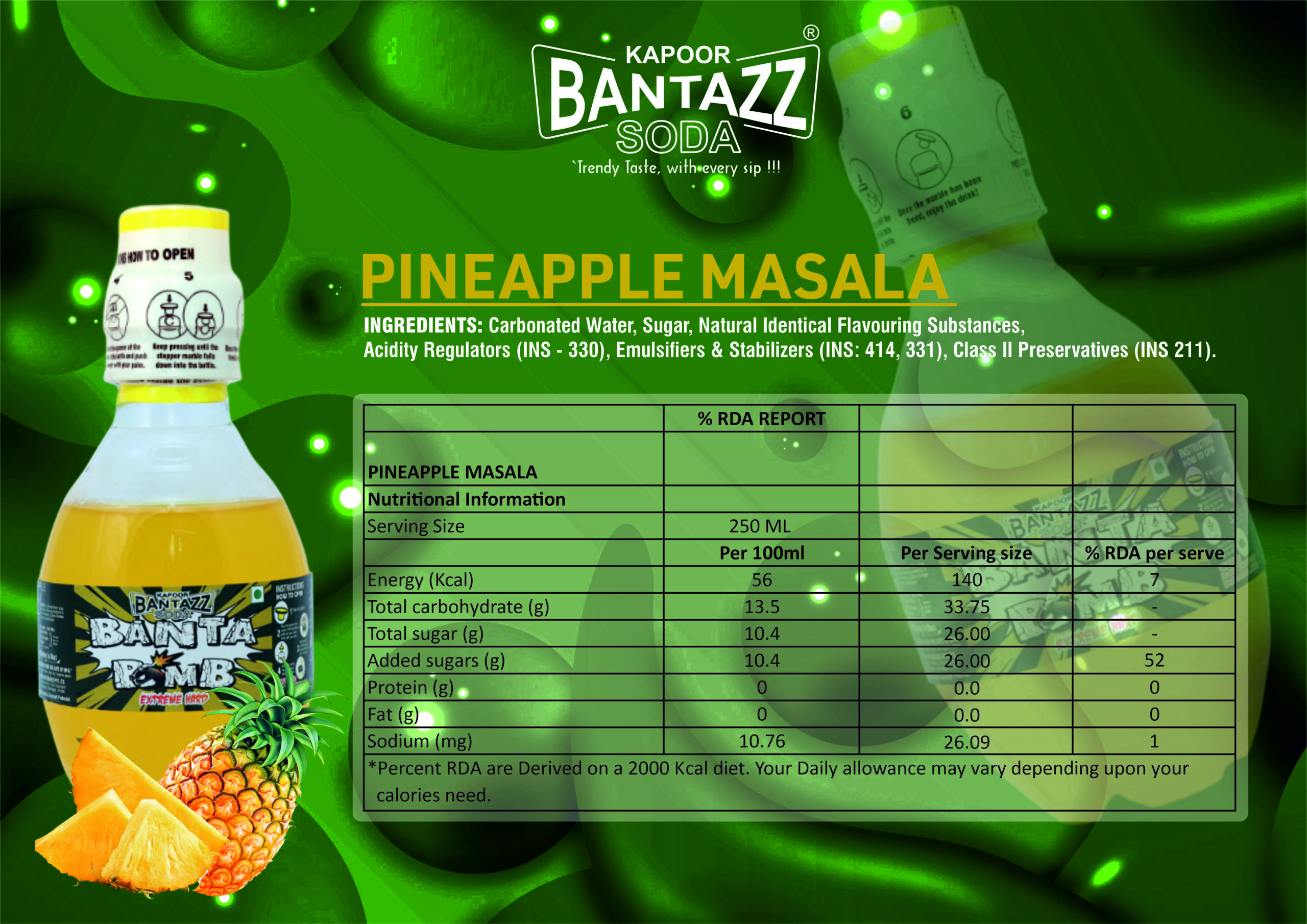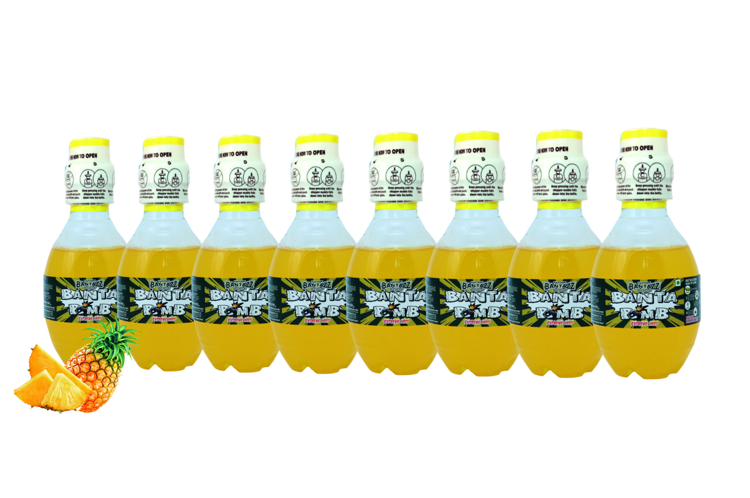 Pineapple Masala Banta Bomb Goti Soda : A powerful mix of sweet pineapple and spicy masala that hits hard. Bold flavour, strong fizz, and a bomb-level refreshment.